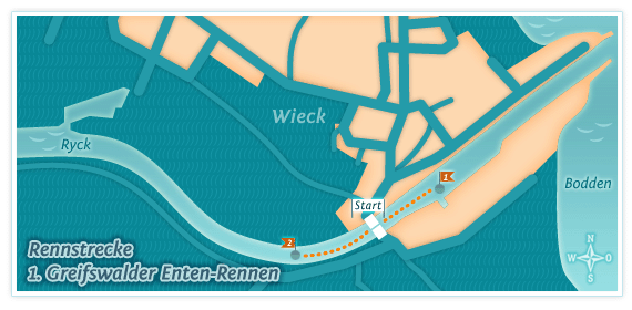 Das 1. Greifswalder Enten-Rennen wird auf der Wiecker Klappbrücke gestartet. Die Renn-Enten werden gleichzeitig aus einem Behältnis von der Wiecker Klappbrücke in den Ryck geschüttet.Die Länge der Renn-Strecke beträgt ca. 75 m. Das Ziel